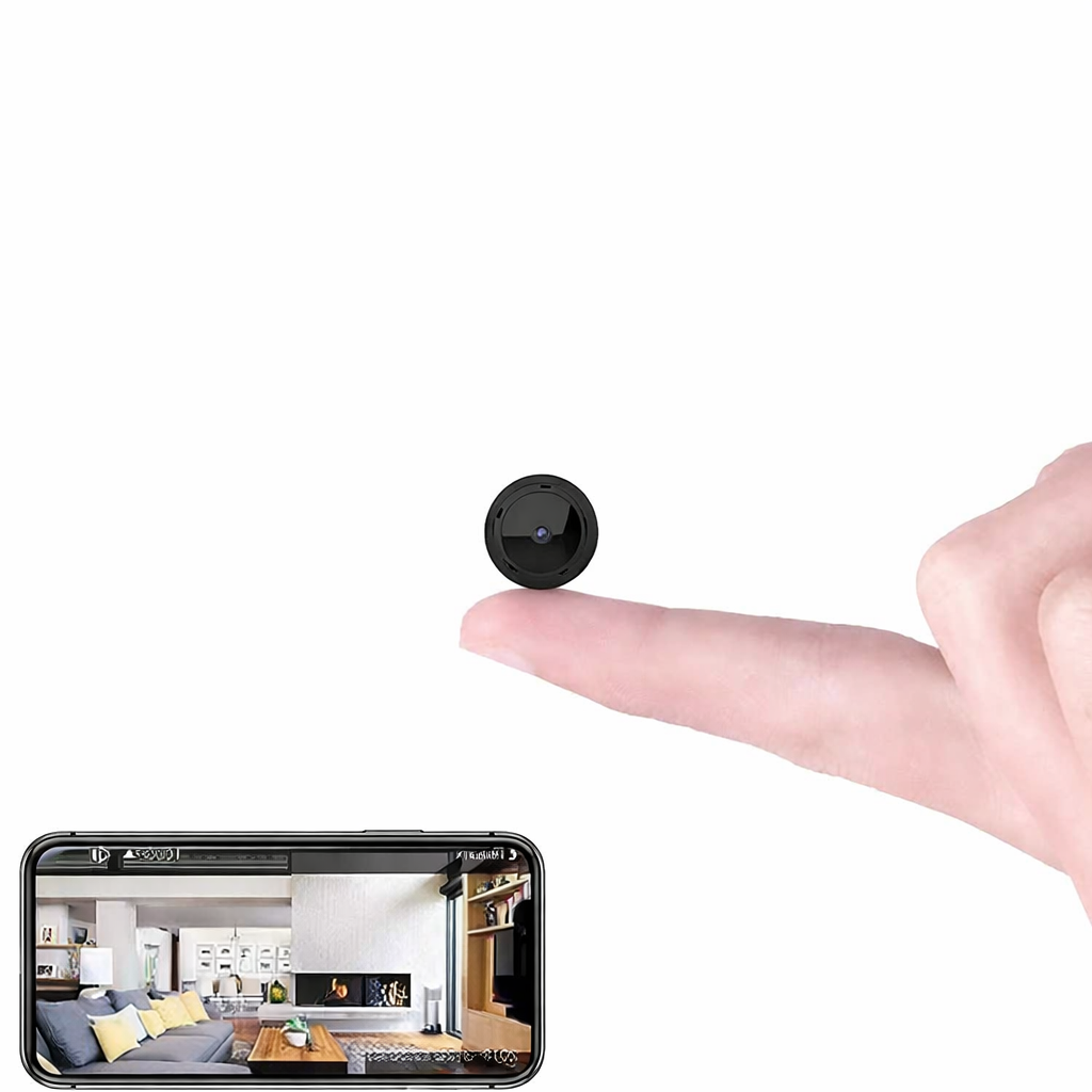 A compact Wi-Fi security camera designed for home monitoring with high-definition video and night vision capability. This small camera connects to a wireless network to provide live viewing and recording through a compatible mobile app. Its versatile design supports indoor placement for general home security and awareness.